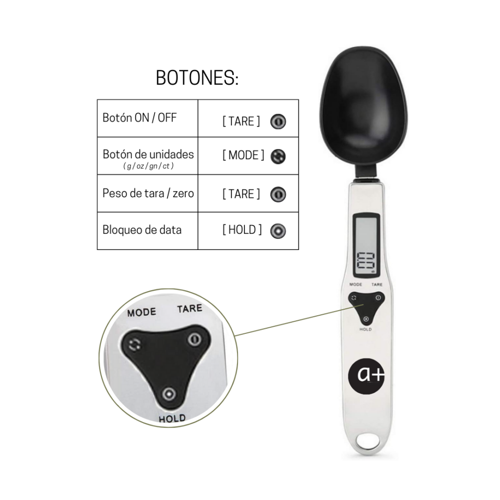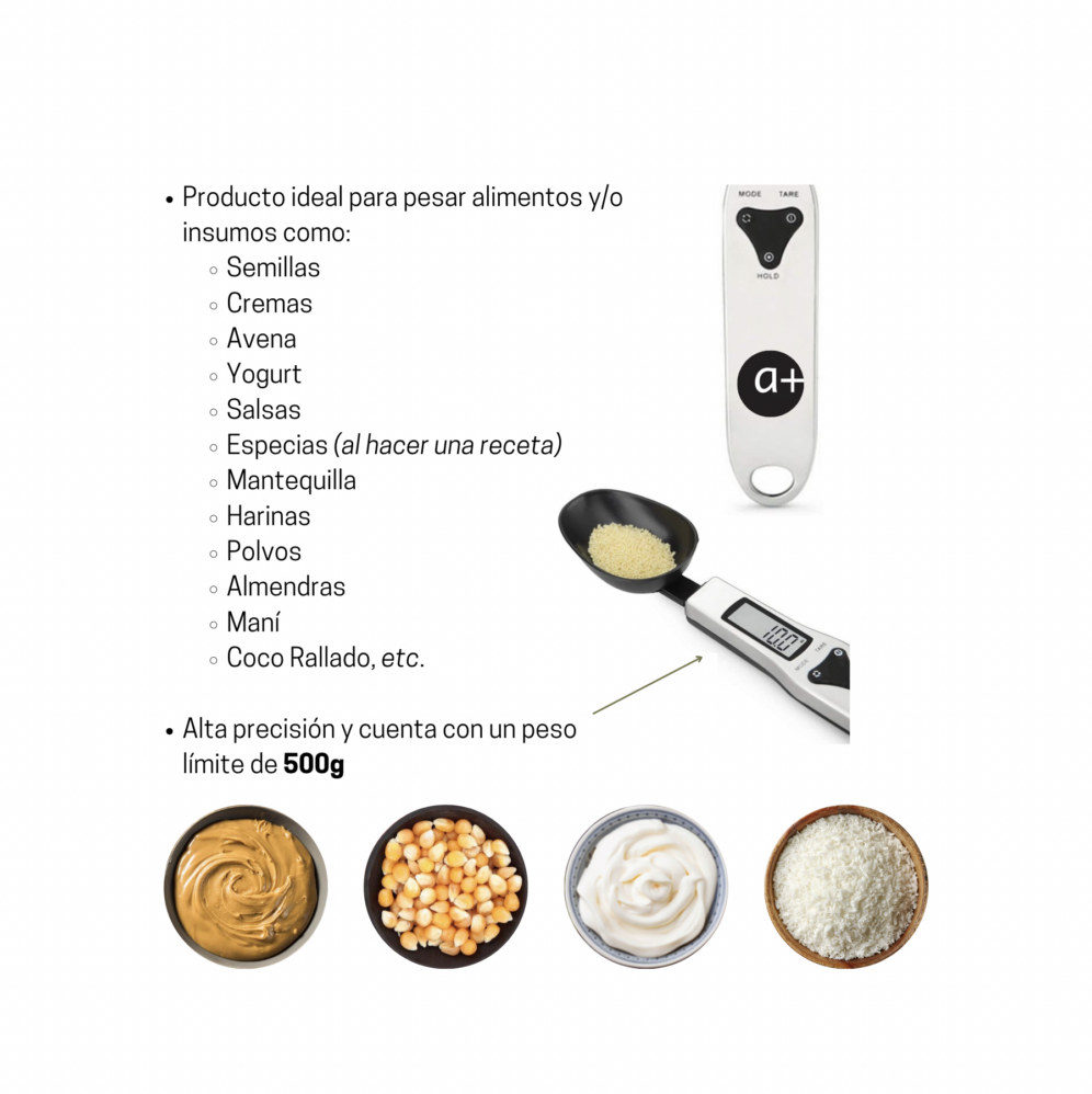 Bajo uso de energía: utiliza baterías de 2 AAA y luego de 59 segundos sin uso se apaga de forma automática (no mojar el mango de la cuchara).